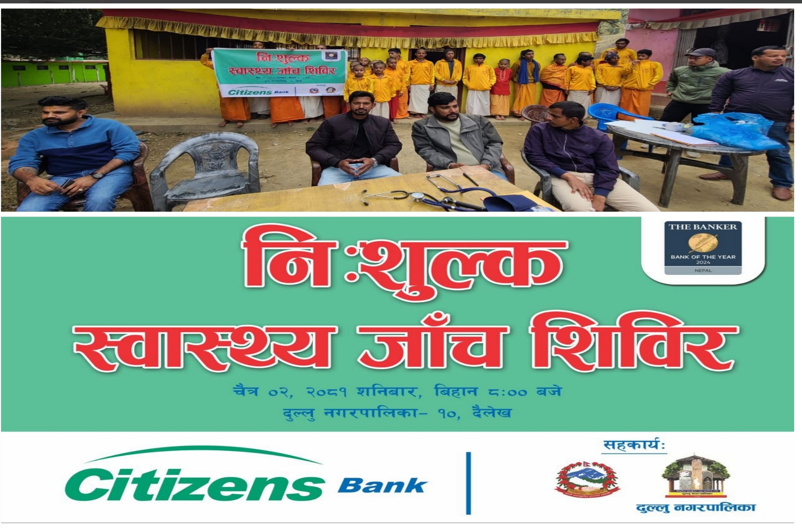 सिटिजन्स बैंक दुल्लु शाखाद्वारा निःशुल्क स्वास्थ्य परीक्षण तथा औषधि वितरण